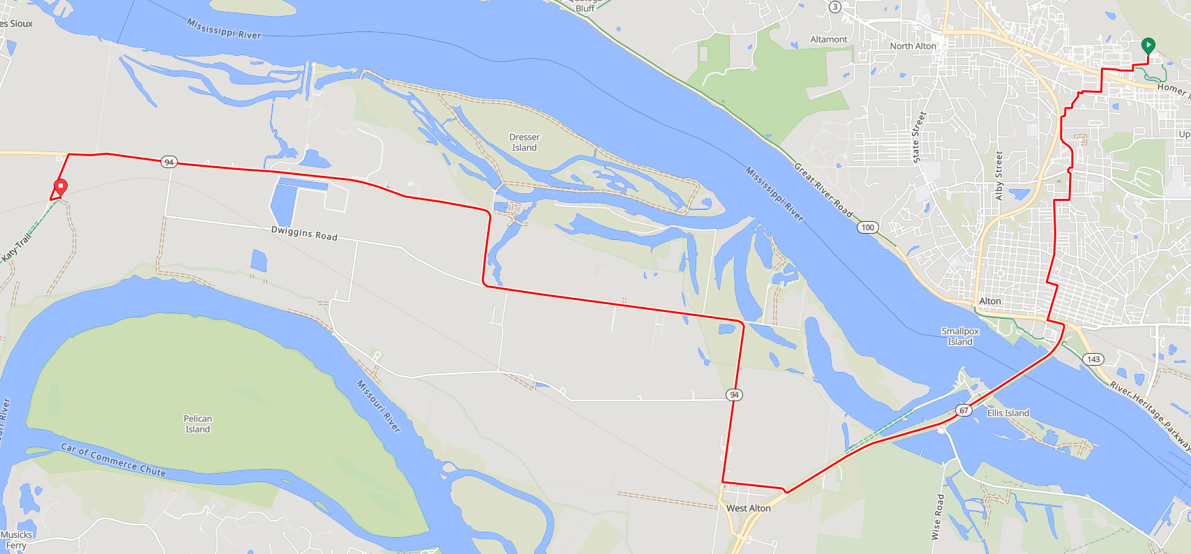 This road cycling route goes from the Amtrak station in Alton, Illinois